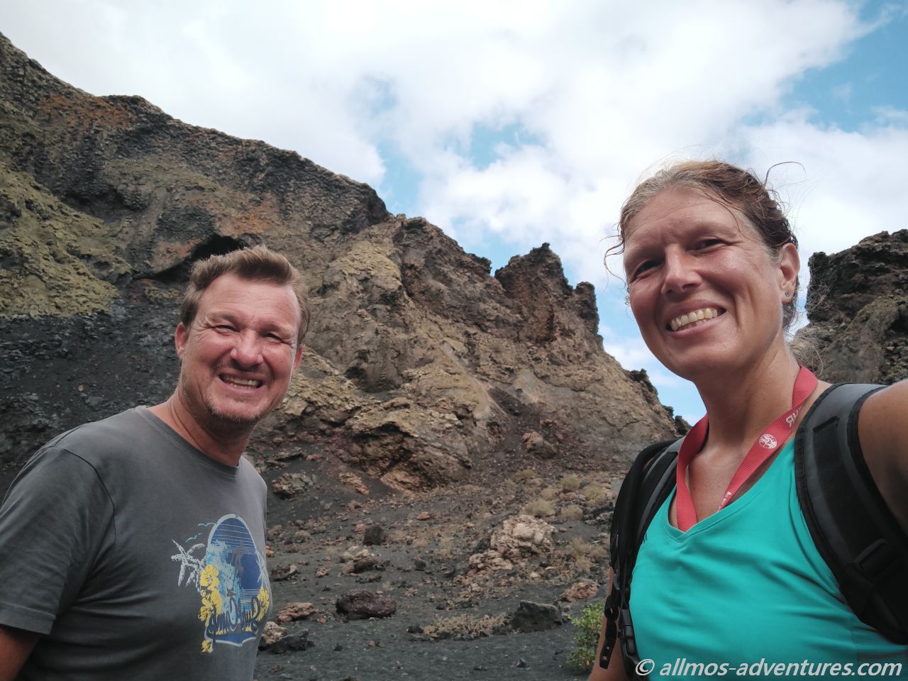 Vom Parkplatz führte ein mit Lavasteinen markierter Weg auf die Caldera de Los Cuervos zu. Am Vulkan angekommen gabelt sich der Weg. Linksherum führt der Weg einmal um den ganzen Vulkan. Rechtsherum geht’s auf dem kürzesten Weg in die Caldera de los Cuervos. Worauf fiel wohl unsere Wahl? Natürlich auf den kürzeren Weg rechts entlang.