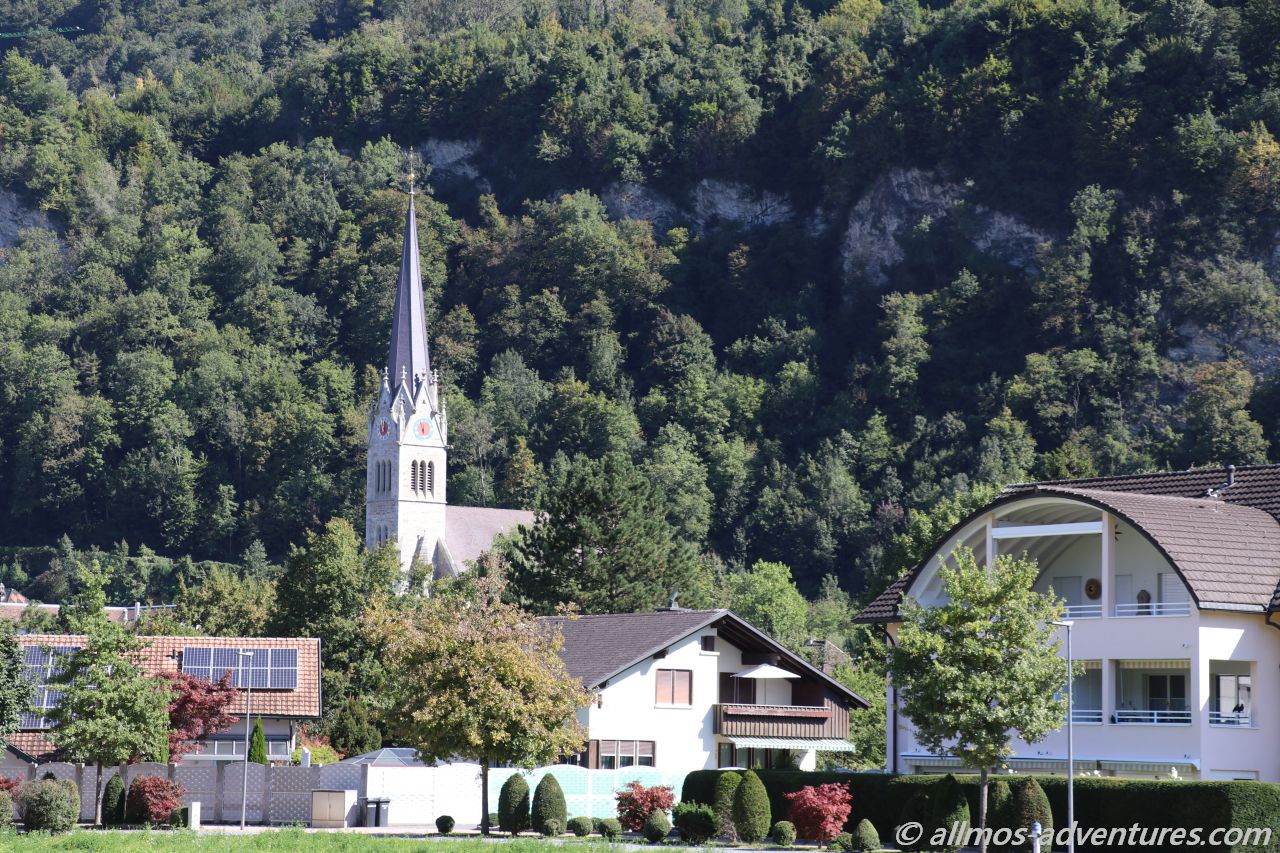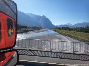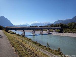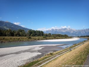 Wir passierten das Drei-Länder-Eck Schweiz-Österreich-Liechtenstein, welches sich auf dem Rhein befindet. Ach ja, kennt man den Rhein bei uns als einen großen Strom, mit Schifffahrt, so ist es hier in der Schweiz ein überschaubarer Fluss, mit halb trockenem Flussbett.