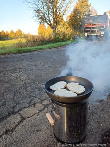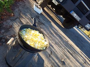 Bereits zum Frühstück kam unser Raketenofen erstmalig zum Einsatz, denn wir hatten nicht genügend Strom, um unsere Brote zu toasten. In der irgendwann heißen Pfanne brieten wir dann direkt noch Spiegeleier. Das Abendessen bereiteten wir ebenfalls auf dem Raketenofen zu. Es gab köstlich krosse Bratkartoffeln mit Zwiebeln, dazu die Döner-Reste von gestern. Zum Tagesausklang gönnten wir uns einen Maricooler (Malibu mit Maracuja Saft).