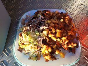 Die Sonne hatte sich leider verzogen und es fing an zu nieseln. Zum Abendessen gab es daher kalte Bratkartoffeln mit Schwarzwälder Schinken.