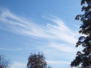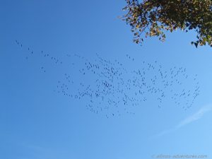 Während ich auf der Bank in der Sonne saß war plötzlich lautes Geschnatter aus der Luft zu hören. Ein riesiger Schwarm Wildgänse flog über uns hinweg. Doch es kam weiterhin Geschnatter von links. Ein Blick an Allmo vorbei ließ mich zwei weitere riesige Schwärme Wildgänse erblicken. Über mir vermischte sich dann der zweite mit dem dritten Schwarm.
