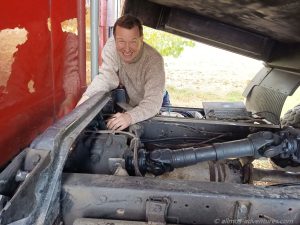 Nach dem gestern nur kosmetische Dinge an Allmo verbessert wurden ging Frank morgens direkt dem Umschalter-Problem „Gelände / Straße“ nach. Nach einigen Stunden und einem Telefonat mit Alex entschied er sich mit dem Rad ins Dorf zu fahren. Dort hatten wir Samstag auf dem Hinweg ein Schild mit „IVECO Trucks Werkstatt“ gesehen. Ich durfte in der Zwischenzeit auf Allmo aufpassen, der immer noch mit hochgepumpter Fahrerkabine in der Sonne stand.