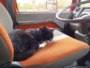 Frank investierte Zeit in Allmo. Zum Beispiel montierte er die Tote-Winkel-Spiegel und schraubte meinen Beifahrerspiegel endlich fest. Bisher musste ich den alle paar Hundert Meter nach oben drücken, damit Frank im Spiegel etwas sehen konnte. Ich kümmerte mich währenddessen um unser Chaos bzw. das suboptimale Ordnungs- und Aufbewahrungssystem. Es war noch einiges im Argen. Emma verbrachte den ganzen Tag bei schönstem Sonnenschein im Koffer. Das aufgeklappte Dach jagte ihr etwas Angst ein, so dass sie sich in ihrer Höhle verkroch.