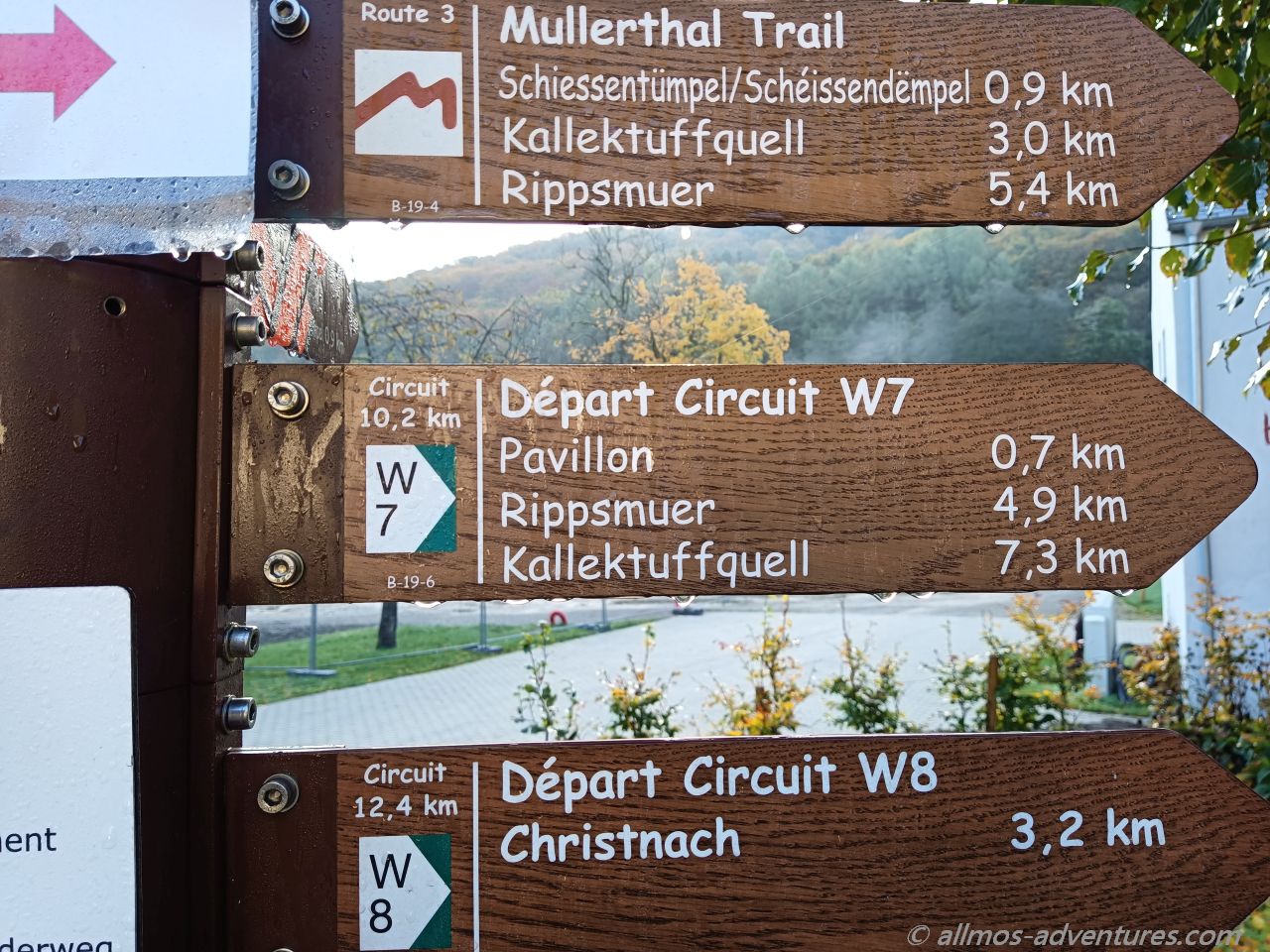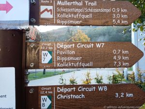 Aufgrund der Überschwemmungen von Ende Juli mussten wir einen kleinen Umweg entlang der Hauptstraße nehmen, um die Tourist-Info in der Herringer Mühle zu erreichen. Dort ergatterte ich eine aktuelle Wanderkarte für 4 Euro. Die Wanderkarte, die wir in Echternach geschenkt bekommen hatten, war eine ältere Version, die den Weg W7 nicht beinhaltete.