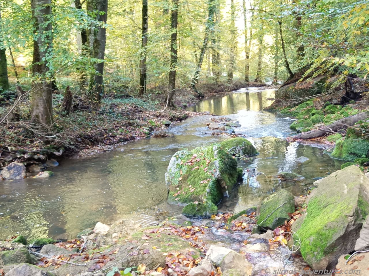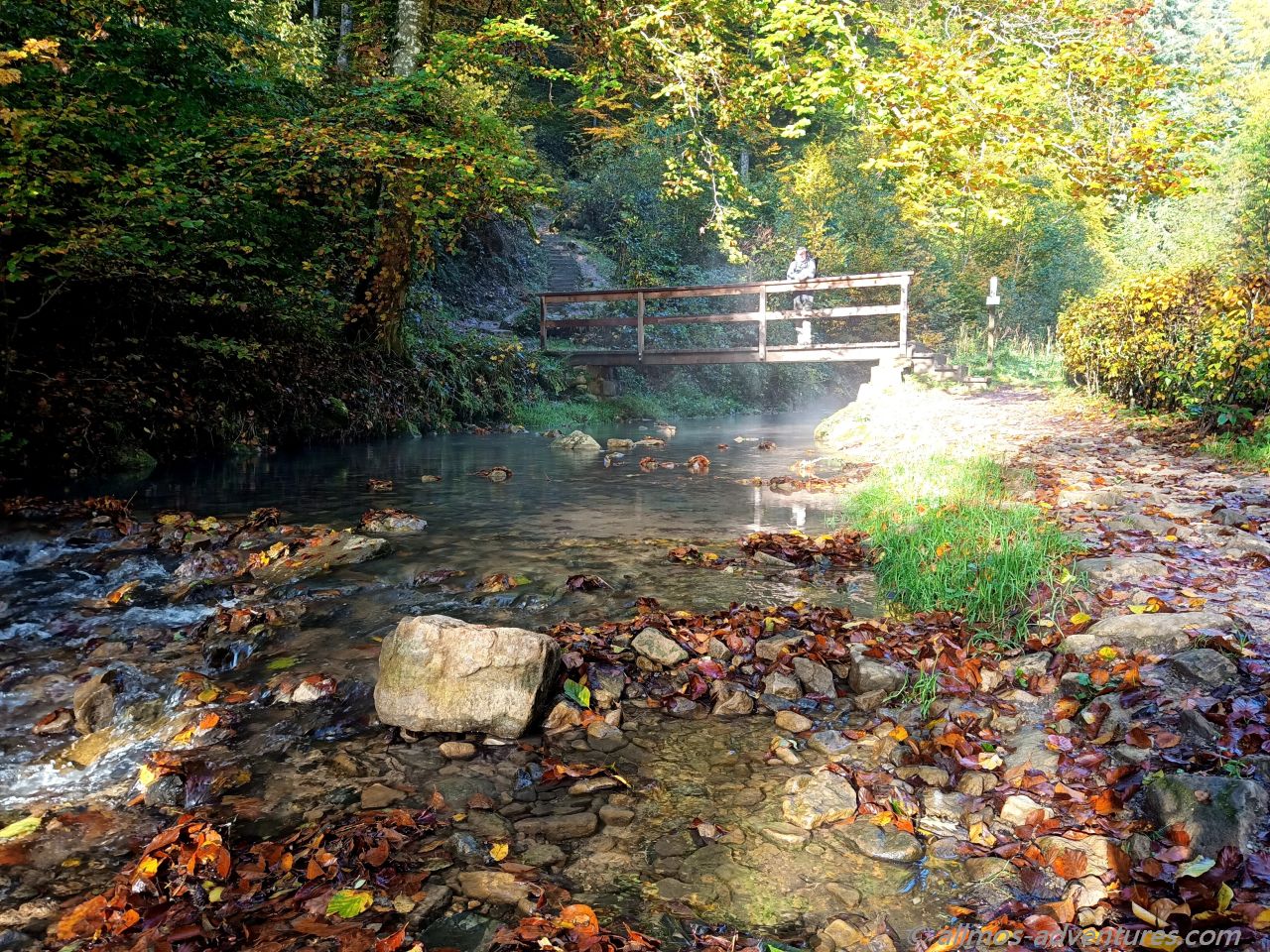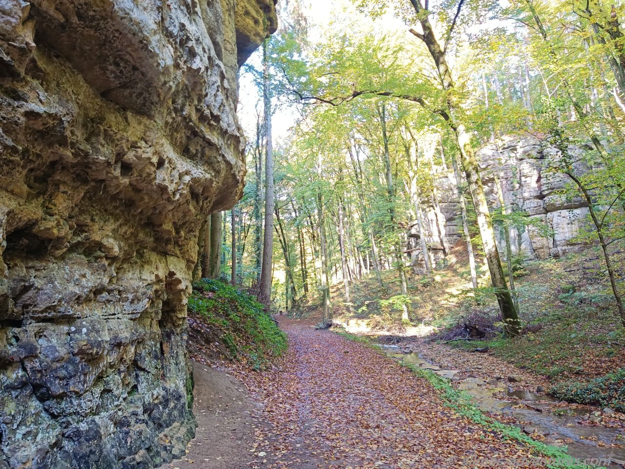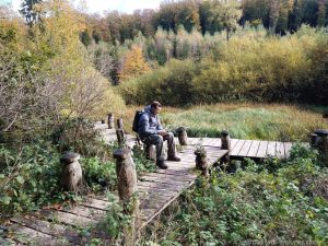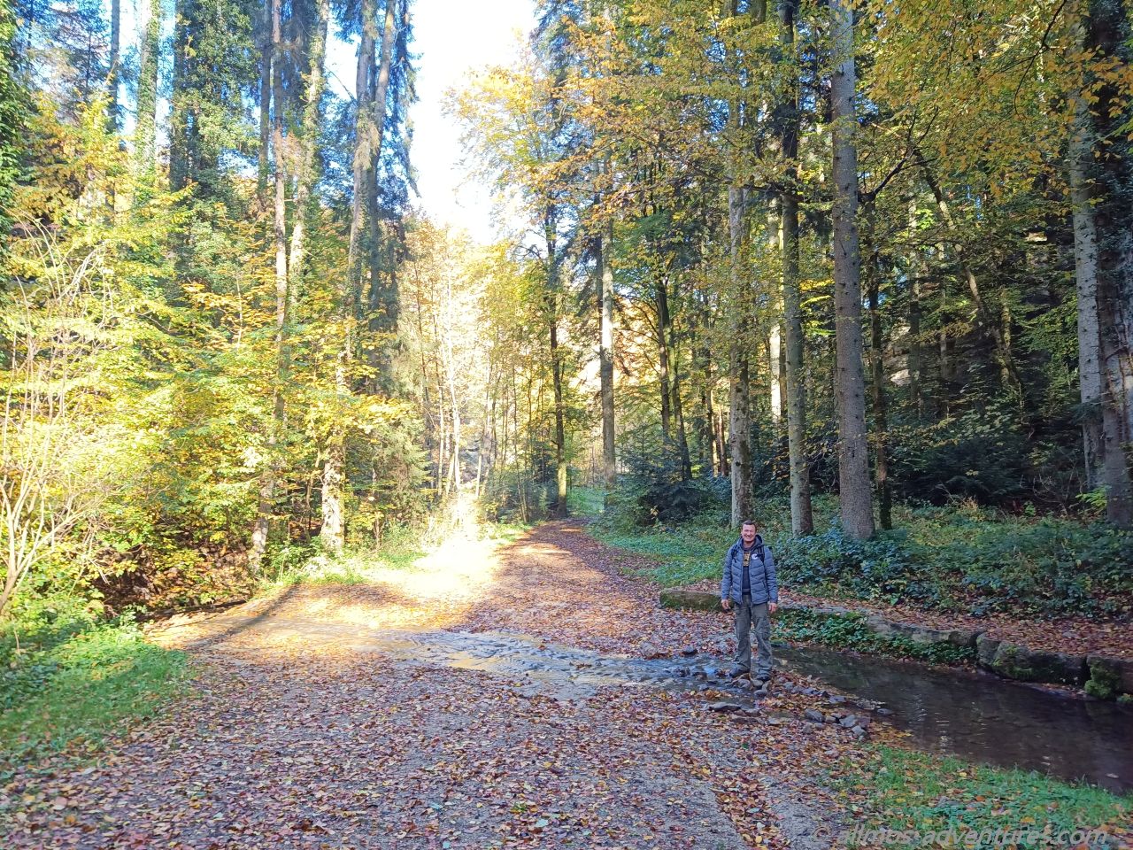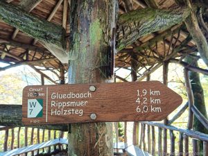 Nach einem kleinen Abstecher ins Ripsmuer setzten wir unseren Weg auf dem W7 fort. Es ging natürlich wieder durch Wald, ganz viel Wald, vor lauter herabgefallenem Laub war teilweise der Weg nicht sichtbar. Als es endlich spannender werden sollte (Weg über Holzbrücken am Wasserlauf entlang) standen wir vor einer Umleitung. Wir waren genervt und geschafft. Anstatt ebenerdig am Wasser entlang zu laufen quälten wir uns die asphaltierte Straße hoch und bogen völlig erledigt wiedermal in den Wald ab. Wir liefen und liefen, vorbei an den Sehenswürdigkeiten die es unten am Weg gegeben hätte. Ein Abzweig rechts führte uns gefühlte Kilometer später wieder auf die untere Stecke.