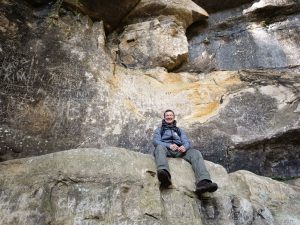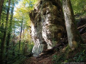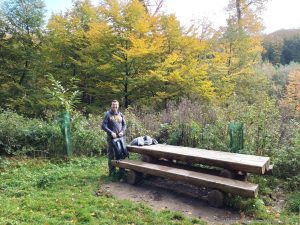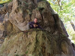 Wir folgten den W7 Schildern hoch in den Wald. In der Sonne war es richtig schön. Entlang interessanter Felsformationen kamen wir fast wieder bei Allmo aus, doch der Weg führte uns weiter von Allmo weg. Über die Straße und eine Metallbrücke gingen wir durch Wald mit Felsen, bis es nur noch waldig war. Der Weg wurde nun recht unspektakulär und wir quälten uns Kilometer für Kilometer durch den schattigen Wald. An einer Lichtung stand eine große Picknickbank, die bereits mit einem Paar aus den Niederlanden besetzt war. Wir gesellten uns dazu und stärkten uns in der Sonne.
