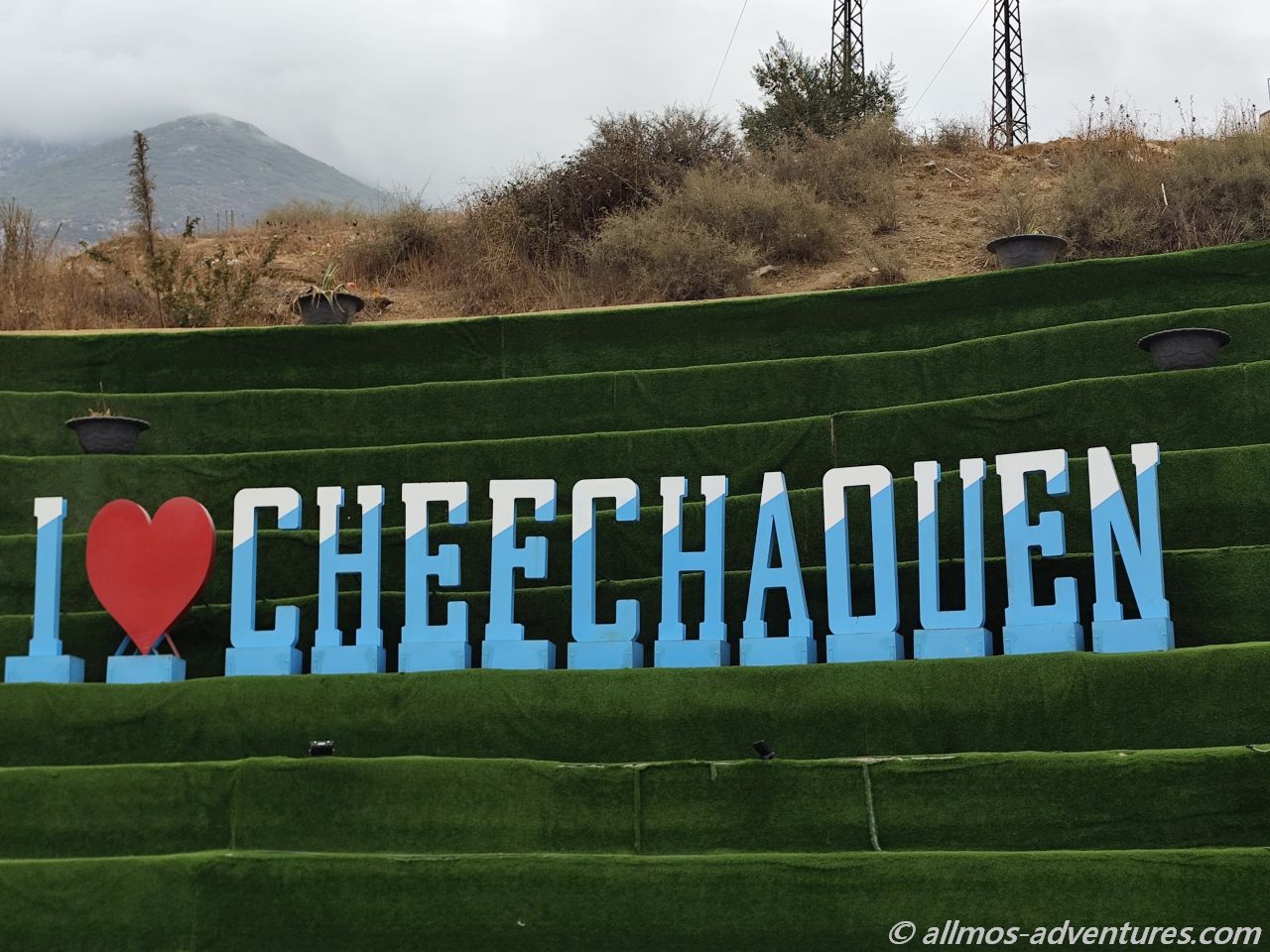 Auf dem Weg raus aus der Stadt kamen wir an einem Kreisverkehr aus, neben dem auf einer Wand „I love Chefchaouen“ stand. Frank hielt auf einer der geschotterten Flächen neben dem Kreisel, während ich zum Fotos machen Ausstieg.