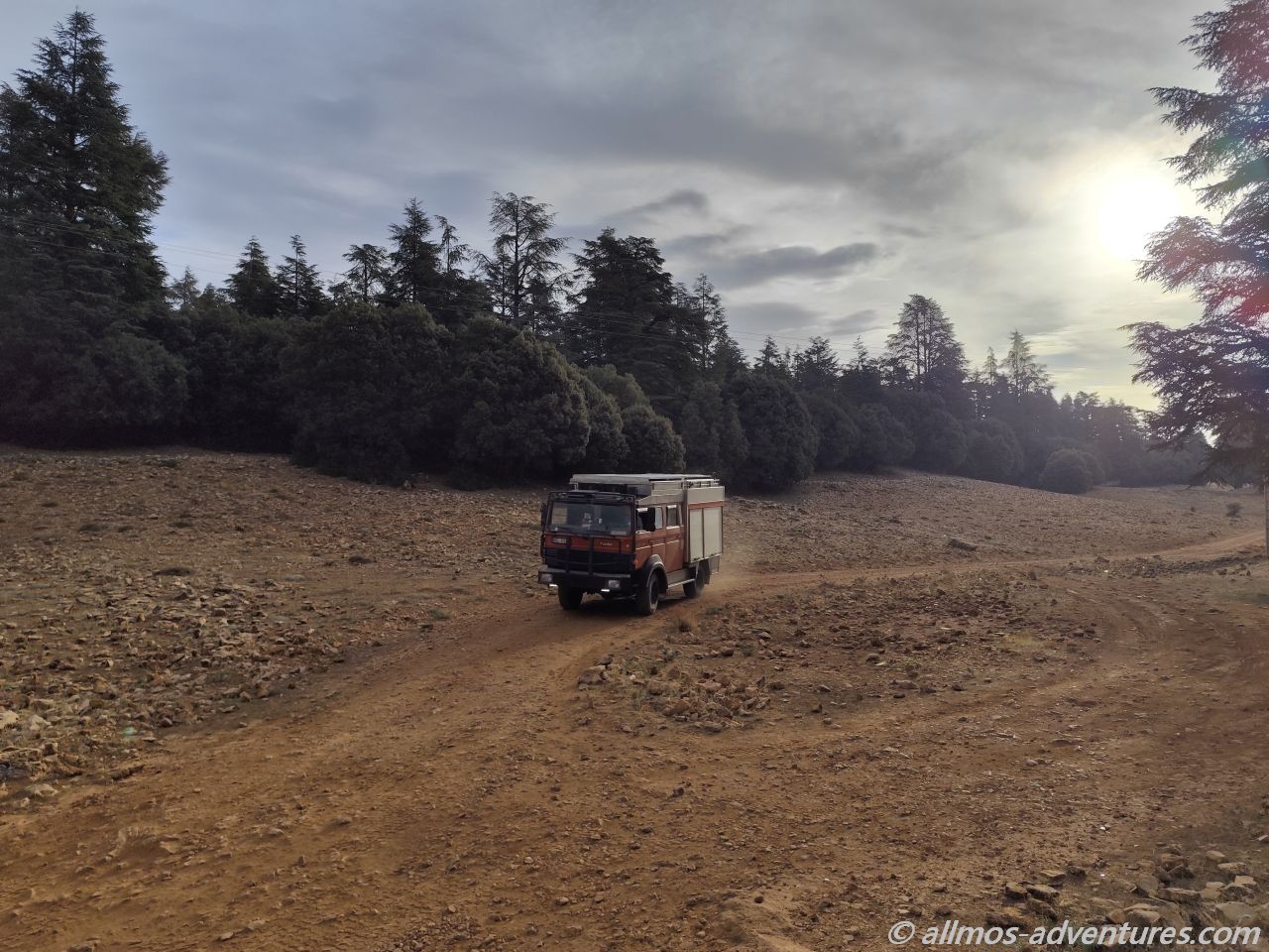 Hinter Ifrane bogen wir links ab und folgten der schmalen Straße in Richtung Ras El Ma. Am Waldrand fanden wir einen akzeptablen Übernachtungsplatz. Gegen die leichte Schräge halfen nur unsere Bretter und gegen die Glasscherben – Augen auf.