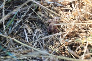 Als wir den Wald endlich hinter uns gelassen hatten und die Sonne uns aufwärmte, stoppten wir an einer Picknickbank neben einem Stoppelfeld. Emma spazierte mit mir den Weg entlang und wieder zum Fahrrad zurück. Das aus dem Feld winzig kleine Frösche über den Weg hüpften, schien sie nicht zu sehen.