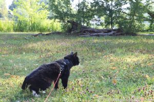 Am Schwanenteich, der sich vor dem Stadtzentrum von Mühlhausen befindet, legten wir eine längere Pause ein. Emma konnte den Rucksack verlassen und kam an die Leine. Sie erkundete die Umgebung in ihrem Leinenradius und machte es sich im Gras mit Blick auf den See gemütlich. Vorbeigehende Spaziergänger beäugte sie misstrauisch. Emma halt…