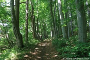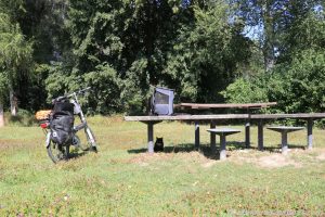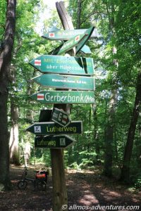 Nachdem mir das Rad zweimal über vom Wind umgeweht wurde, war es an der Zeit den weiteren Rückweg anzutreten. Ab jetzt ging es wieder in den Wald. Mit einem ständigen Blick auf maps.me schafften wir es dann tatsächlich auf dem kürzesten Weg, auch wenn diese Wege durch den Wald teilweise tatsächlich sehr holprig (Baumwurzeln) und wohl eher für Fußgänger gedacht waren, wieder nach Eigenrieden zu gelangen.