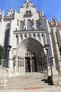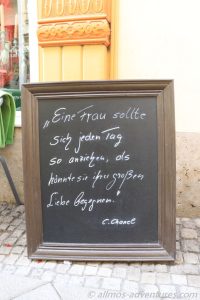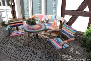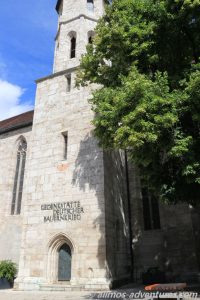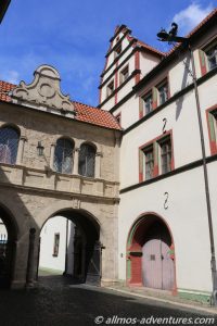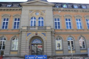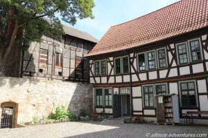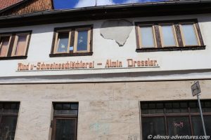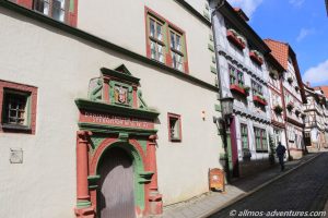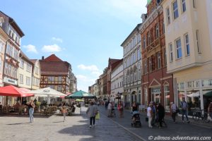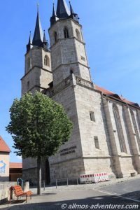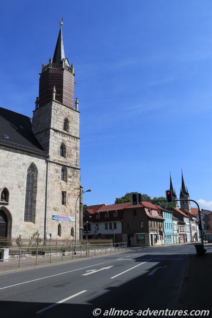 Zufällig lag ein Netto Supermarkt auf unserem Weg in die Stadt und ich kaufte schnell ein paar Kekse und andere „gesunde“ Sachen ein. Danach radelten wir die wenigen Kilometer bis in die Stadt. Der Stadtkern von Mühlhausen ist sehr schön. Es gibt viele kleine Gassen, viele Kirchen und alte Gebäude. Die Stadt hat Charme, doch leider konnte ich nicht alles auf mich wirken lassen. Das Gemaunze aus dem Rucksack wurde einfach unerträglich.