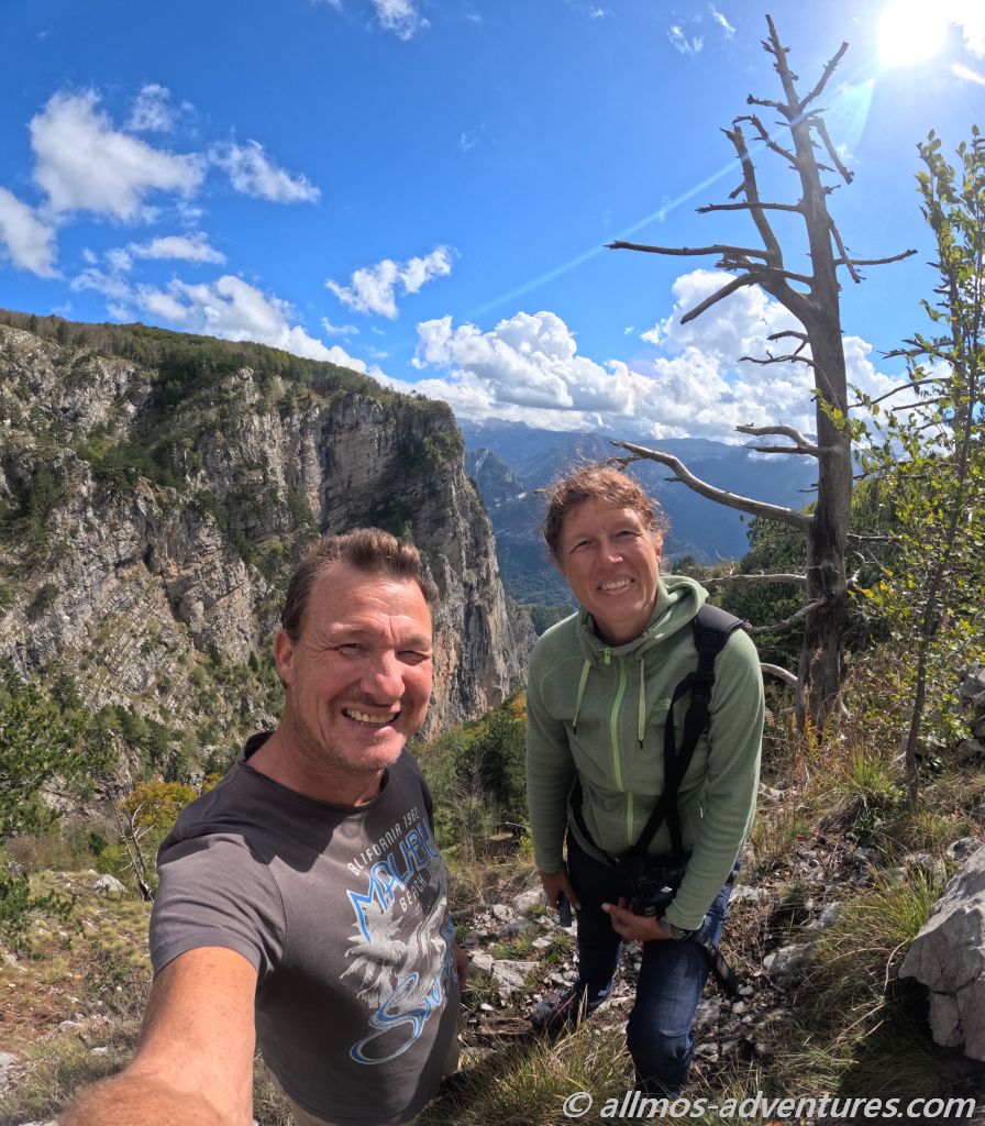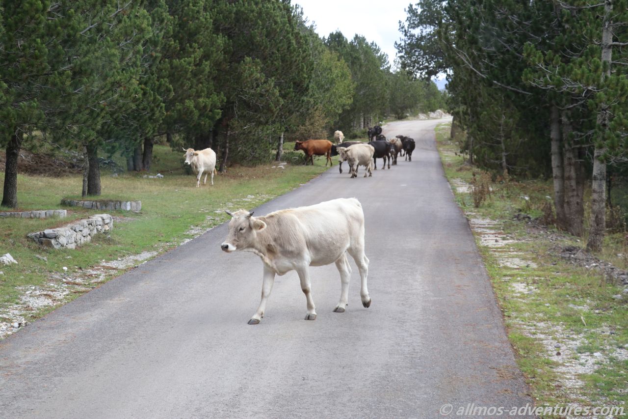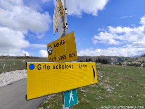 Am zentralen Dreh- und Wendepunkt in Korita (dort, wo die Panoramic Road 4 ihren Scheitelpunkt hat), befinden sich ein paar kleine Restaurants. Wir parkten Allmo neben der Straße und schnürten unsere Wanderschuhe. Auf 1365 Metern Höhe war der Wind, trotz des Sonnenscheins, eher frisch, so dass wir uns lange Hosen und einen Pulli überzogen.