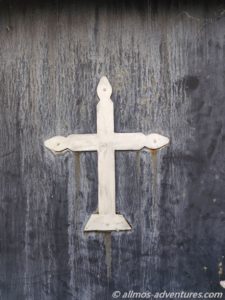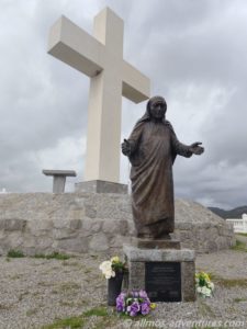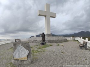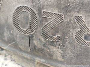Wenig später hielten wir an einem großen Kreuz. Davor stand Mutter Teresa und auf der gegenüberliegenden Seite prangte ein großer Adler als Tor zu einem Hotel. Beim Aussteigen entdeckte ich, dass mein Vorderreifen einen Riss in der Flanke hatte. Wo auch immer der herkam. Mit der Vollbremsung hatte das nichts zu tun. Vielleicht haben wir den auch schon etwas länger, hatten es nur noch nicht bemerkt. Später erteilte mir Frank die Aufgabe den Riss täglich genau zu beobachten. Eine Beschädigung der Flanke ist halt sch…