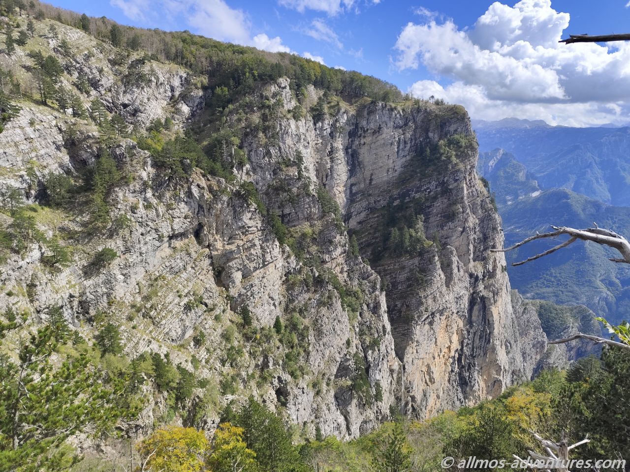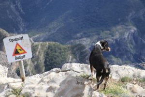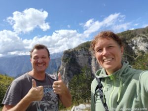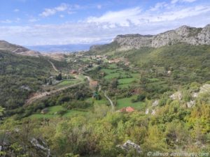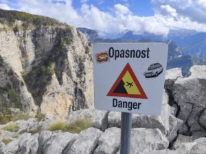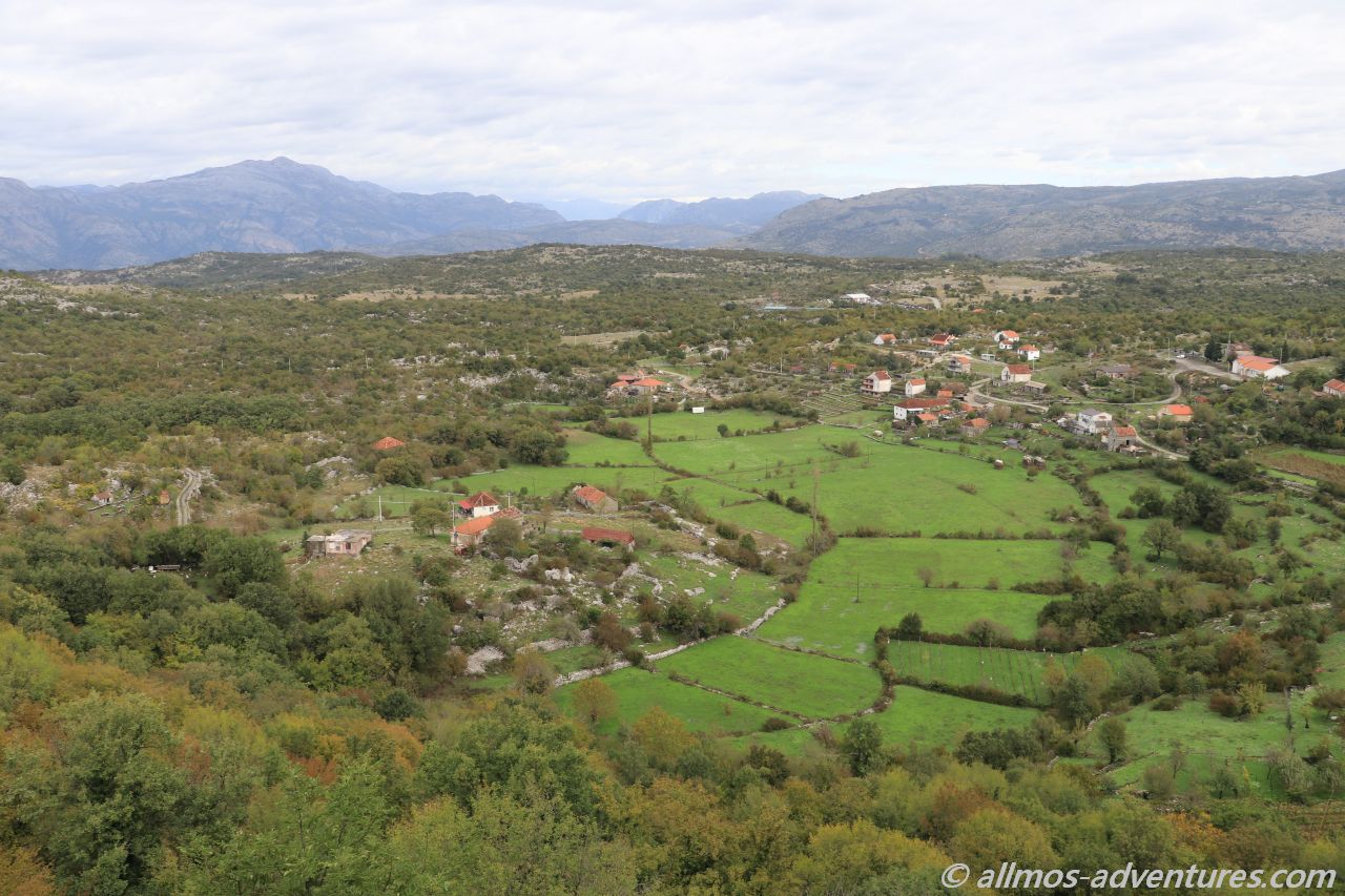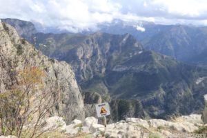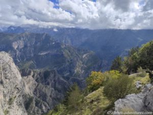 Bereits vor dem eigentlichen Aussichtspunkt Grlo Sokolovo (Viewpoint Falcon’s Throat, also die Kehle des Falken) konnten wir einen Blick auf den Cijevna Canyon und die albanischen Prokletije Berge werfen. Heute Morgen hatten wir noch am Fluss Cijevna gestanden, der sich nun auch unten im Tal seinen Weg bahnte und Namensgeber des Canyons ist.