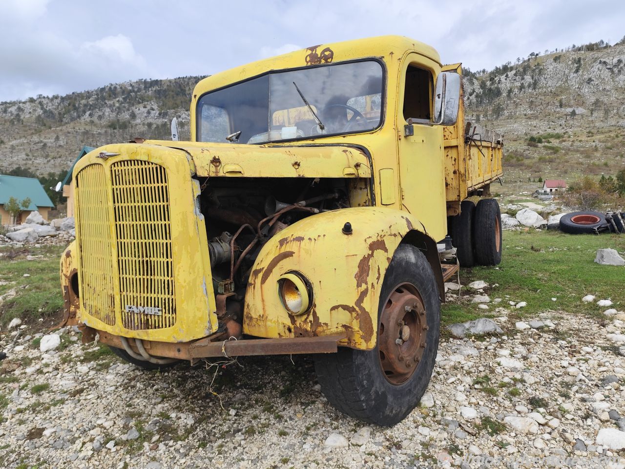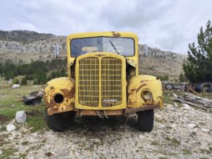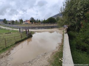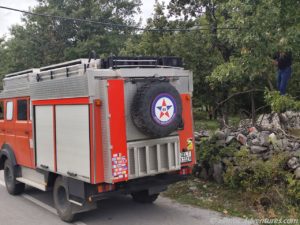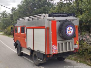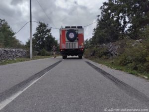 Es handelte sich um eine Wasserleitung, die gewaltig durchhing und die zumindest wohl ganz knapp über den halben Allmo passte. Früher waren wir nicht zum Stehen gekommen. Von dem Grundstück zur linken kam ein Mann herbeigeeilt. Natürlich waren wir beide Ausgestiegen, um die Bremsspur im Bild festzuhalten. Englisch sprach der Herr nicht, nur albanisch. Wobei er wohl auch montenegrinisch konnte. Denn Hvala und Dovidenja konnte er auch sagen. Vermutlich war er froh, dass wir die Wasserleitung nicht abgerissen hatten. Er sprang in das kleine Bäumchen, in dem die Wasserleitung hing und zog daran. Nun war ausreichend Abstand und Frank setzte Allmo ein Stück vor. Der Herr signalisierte noch, dass er die Leitung nun an einem anderen Baum strammziehen wollte und von dem Grundstück zur rechten kam in der Zwischenzeit eine Dame herbeigeeilt. Zusammen kümmerten sie sich um die Wasserleitung und wir fuhren weiter.
