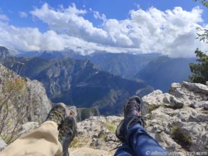 Am eigentlichen Aussichtspunkt gab es zwei geschwungene Sitzbänke, so dass wir entspannt die montenegrinischen und albanischen Berge betrachten konnten. Nach ungefähr einer halben Stunde brachen wir auf und folgten weiter dem Rundweg. Dieser führte über etwas unwegsameres Gelände, war aber dennoch gut zu begehen.
