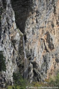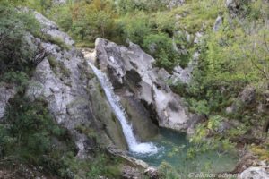 Irgendwann stießen wir auf die richtige Straße und folgten den braunen Schildern „Panoramic Road 4“. Etwas über 60 Kilometer lang ist die ausgeschilderte Panoramic Road 4 mit Start und Ziel Podgorica. Die Straße führte uns auf fast 1400 Metern hinauf nach Korita. Zu Beginn passierten wir einen kleinen Wasserfall, der sich direkt an der Straße in einer Kurve befand. Haltemöglichkeiten gab es nicht und wir hatten Autos hinter uns. Also fuhren wir weiter.
