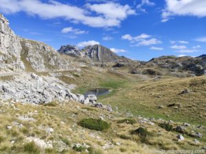 Am höchsten Punkt der Straße (auf ca. 1900 Metern) wehte ein genauso frischer Wind, wie vor zwei Jahren. Ein Straßenhund wurde von mir mit zwei Schälchen Futter beglückt und wollte danach nicht mehr von meiner Seite weichen. Drei junge Australier passten auf ihn oder sie (ich habe nicht so genau hingeschaut) auf, während Frank Allmo vom Parkplatz rückwärts runterfuhr. Dann war es auch nicht mehr weit bis zum Vrazje jezero, einem hübschen See.