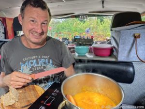 Unser Abendessen (die Reste der Kürbissuppe) erwärmten wir in der Doka. So eine mobile Kochplatte ist schon praktisch. Als Nebeneffekt wurde es in der Doka direkt mollig warm. Wobei wir uns nun annähernd auf Meeresspiegelniveau befinden und nicht auf 1400 Metern wie die vergangene Nacht. Das macht ja auch schon einen Temperaturunterschied.