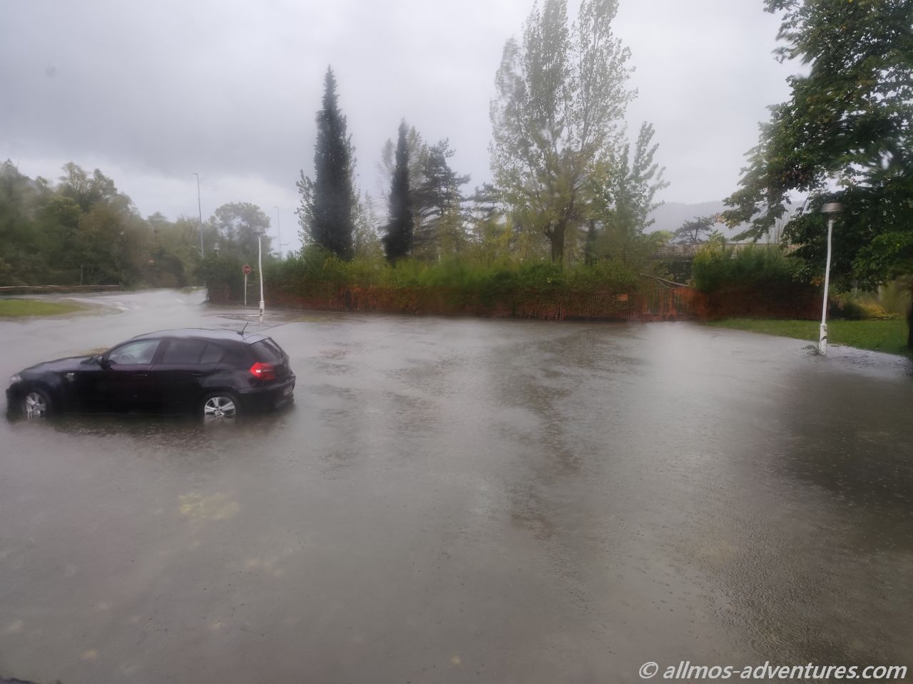 Waren auf dem Parkplatz gestern Abend vereinzelte Pfützen zu sehen, so hatte der Platz sich über Nacht in einen einzigen See verwandelt. Hinter uns stand noch immer der BMW geparkt, der nun bis zur Hälfte der Reifen im Wasser stand. Ob das so gut ist?