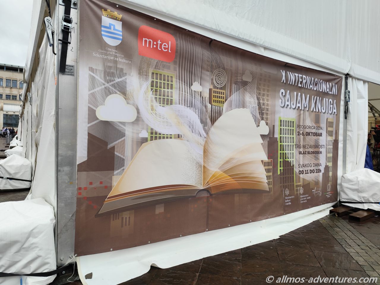 Hinter ging es zum Fluss Moraca, dessen braune Brühe eine enorme Fließgeschwindigkeit hatte. Der Biergarten, der sich direkt am Fluss befand, lag heute im Fluss. Über die kleine alte Fußgängerbrücke, die den kleinen Fluss Ribnica überspannt, führte mich mein Weg weiter zum Platz der Republik. Auf diesem war ein großes Zelt aufgebaut. Wie es aussah, fand dort eine Buchmesse stand. Auch der Brunnen, als zentraler Punkt des Platzes, war in das Zelt integriert.