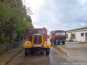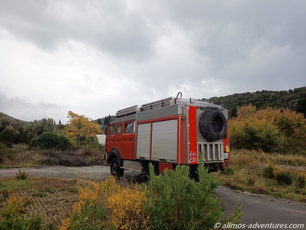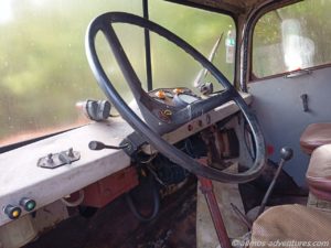 Ein letztes Mal stoppten wir noch, als Frank ein altes Feuerwehrauto neben einem Gebäude stehen sah. Natürlich musste er Allmo neben dem älteren Bruder platzieren. Wie der Zufall es wollte, war die alte Feuerwehr neben einem verlassenen Gebäude abgestellt. In der ehemaligen (Produktions-) Halle stapelte sich Heu, so roch es auch.