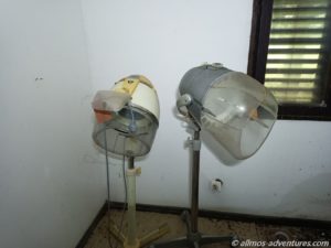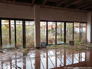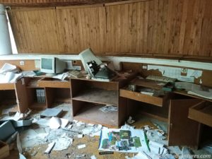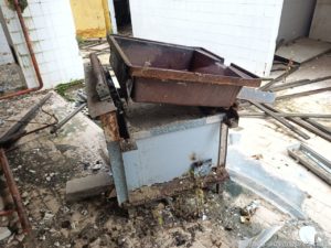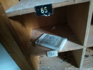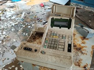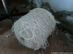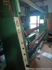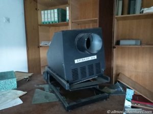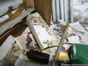 Den ersten Maschinen, die wild in einem Raum, zusammen mit Stühlen, verfrachtet wurden, konnte ich zunächst keine Verwendung zuordnen. Doch im eigentlichen Bürotrakt kam ich dann dahinter. Es handelte sich wohl mal um eine (Teppich-) Weberei. Dicke Rollen mit hellem Garn, Garnmuster und Webvorlagen befanden sich in den Schränken. Natürlich auch Aktenordner mit Geschäftsunterlagen aus den 1990er Jahren. Das letzte Kalenderblatt war von September 2006. Sogar ein Episkop und ein Tintenstrahldrucker waren vorhanden. Wasser drang an so einigen Stellen ins Gebäude.