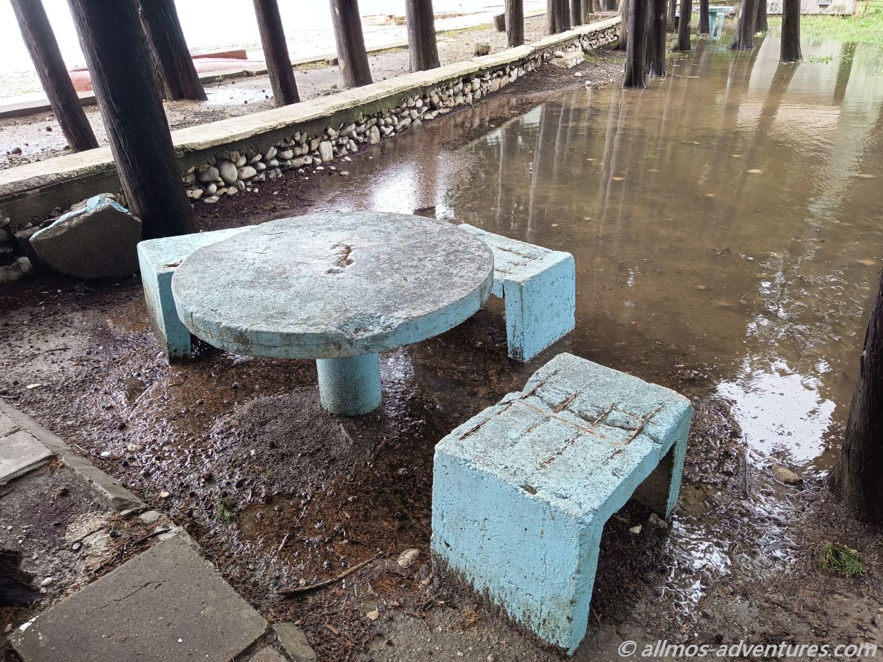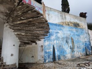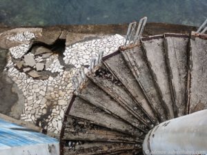 Über dem offenen Bar-Bereich (mit einer Snack-Bar) gingen wir die Wendeltreppe nach unten, an den etwas brüchigen Beton-Strand. Ein schmaler Weg führte uns am Wasser entlang zu einer nicht ganz so alten Strandbar, die aber auch geschlossen hatte. Parallel zum Meer befand sich ein rechteckiger Pool mit einem Schwimmer und Nicht-Schwimmer-Bereich. Bereits von einem Aussichtpunkt hatten wir diesen Pool, der farblich so gar nicht in die Landschaft passte, erblicken können.
