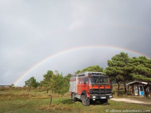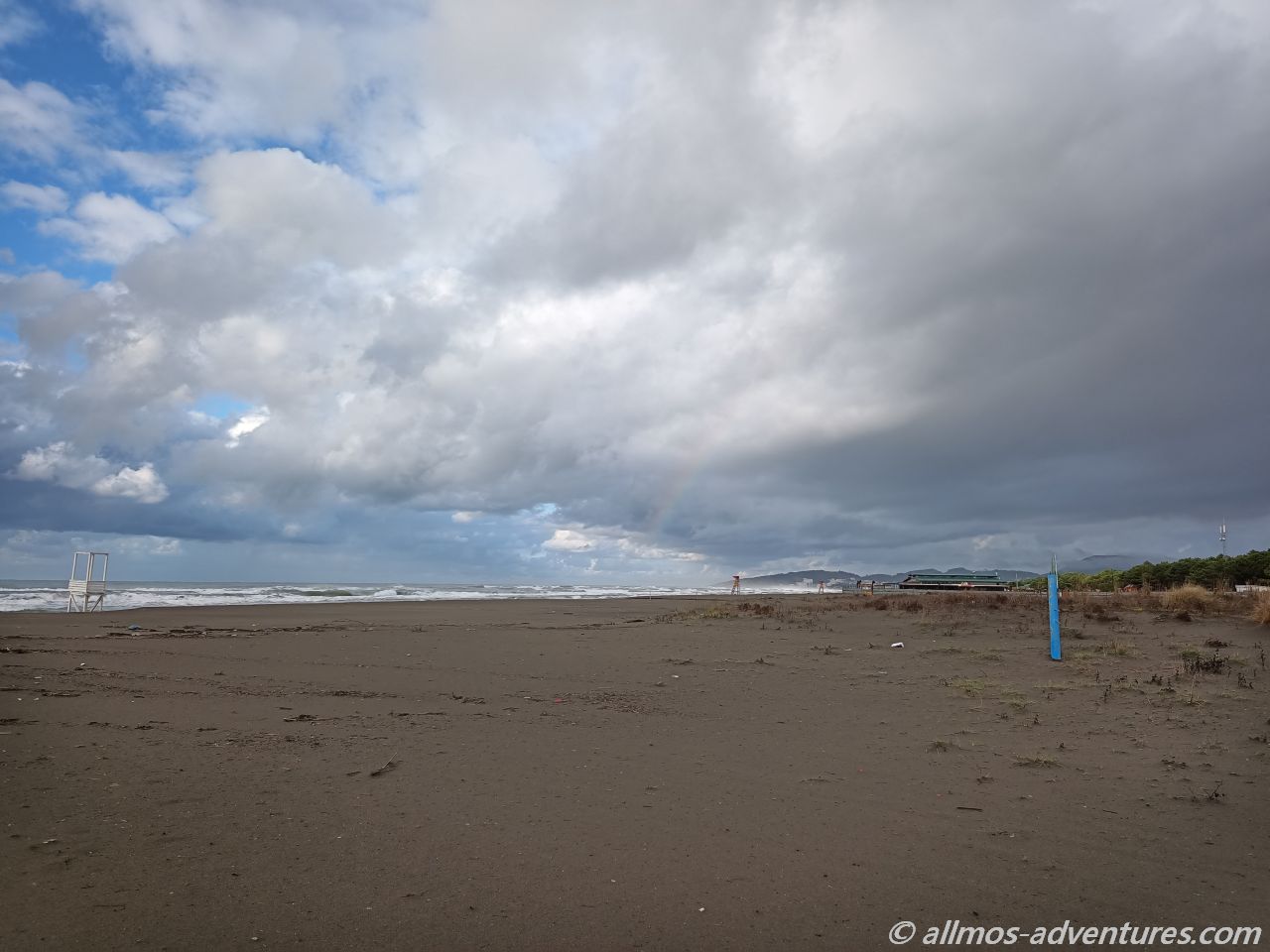 Der Morgen startete tatsächlich etwas freundlicher. Die Sonne blinzelte aus den Wolken hervor und als leichter Nieselregen einsetzte wurden wir mit einem riesigen Regenbogen belohnt.