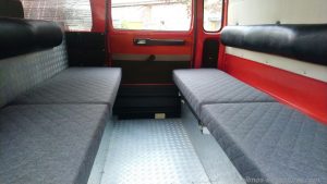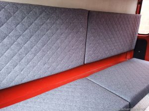 Passend zu den Sitzbänken bezogen wir auch noch Rückenpolster für die Rückwand der Doka. Die Rückenpolster sind so gebaut, dass sie direkt noch eine zweite Funktion erfüllen. Und zwar können wir diese zwischen die beiden Sitzbänke montieren und schaffen somit einen zusätzlichen Schlafplatz in der Doka.