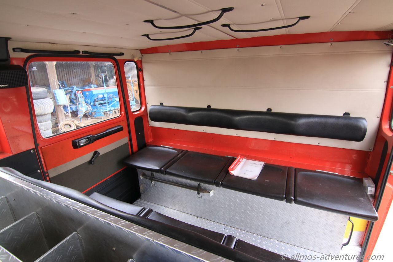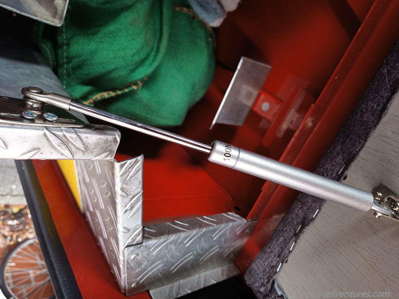 Die alten Sitzbänke waren durchgehend und somit gibt es auf jeder Seite nur einen Dämpfer. Wir entschieden uns jedoch dafür die neuen Sitzbänke zu teilen, somit haben wir auf jeder Seite zwei klappbare Sitzbänke. Wir kauften noch zwei zusätzliche Gasdruckfedern** und montierten diese. Nun sind alle 4 Sitzbankhälften perfekt ausgestattet, was uns das Leben leichter macht.