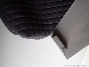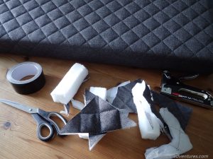 Voller Spannung bezogen wir das erste Sitzpolster. Es passte, wenn auch teilweise etwas knapp. Den Stoff befestigten wir auf der Rückseite mit Tackernadeln und klebten Panzerband über die unsaubere Schnittkante. Leider entpuppte sich das Panzerband eher als ein nicht-Klebeband. Daher schlugen wir ein paar Wochen später den Stoff um und tackerten erneut.