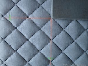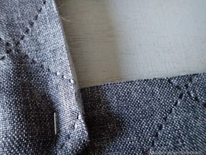 Nachdem die Tischlerplatten passend geschnitten und aus optischen Gründen mit Osmo Dekorwachs Farbe in hellgrau bepinselt und der Kaltschaum entsprechend geschnitten war, konnten wir den Polsterstoff ausmessen, zurechtschneiden und anzeichnen. Danach nähte uns Franks Mama – mit Unterstützung von seinem Papa – die Ecken in den Stoff.
