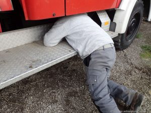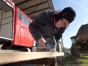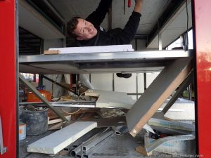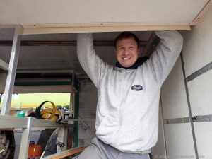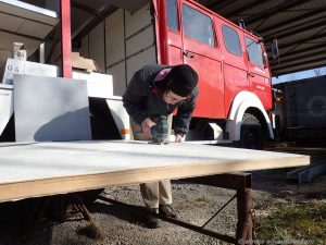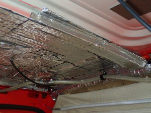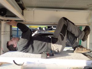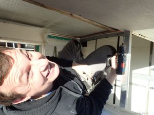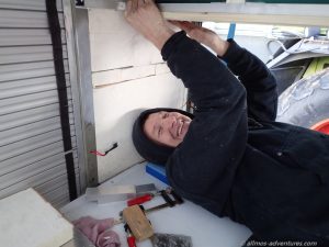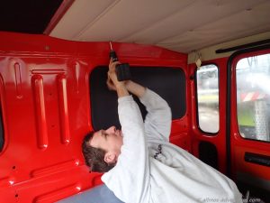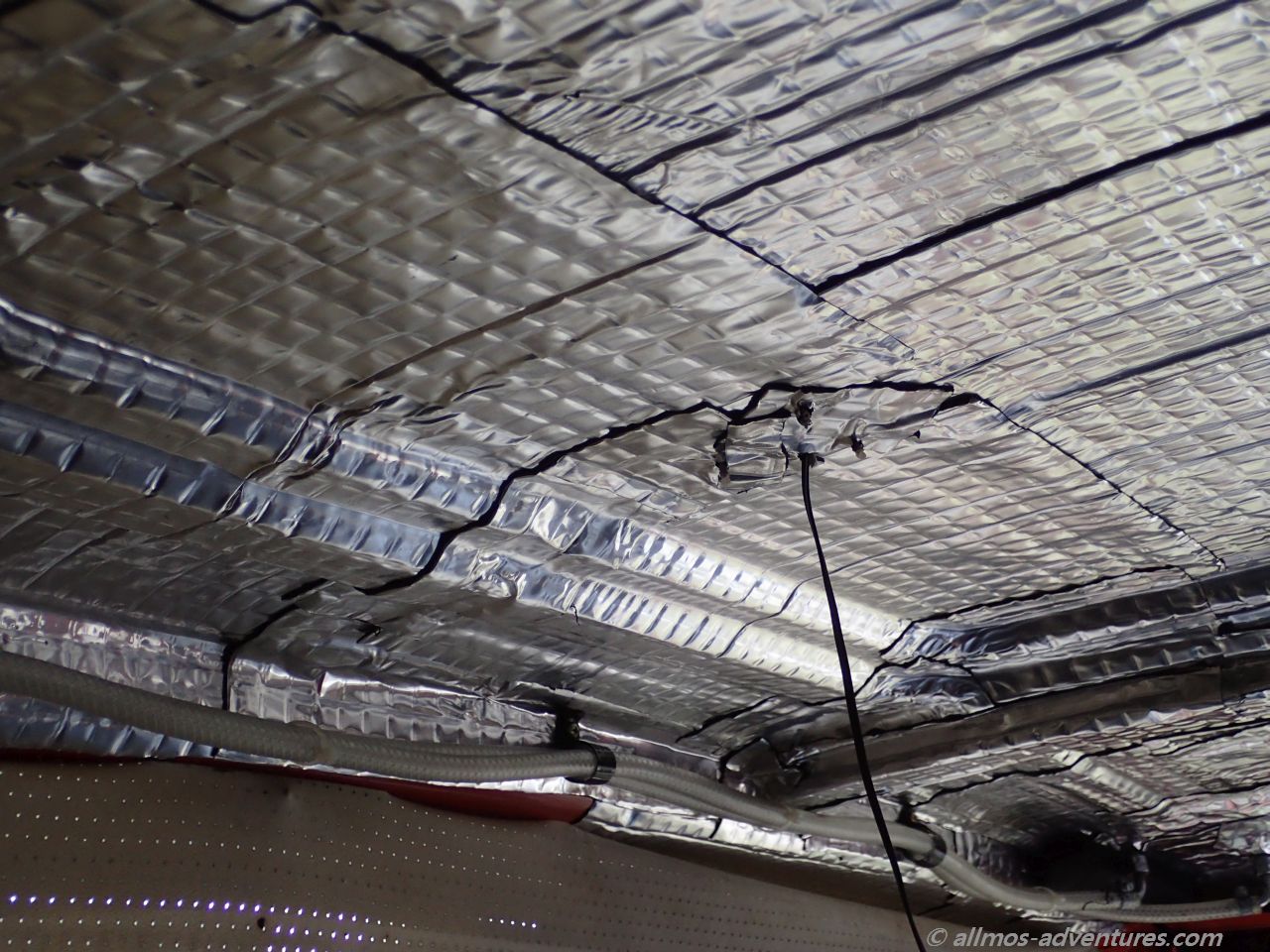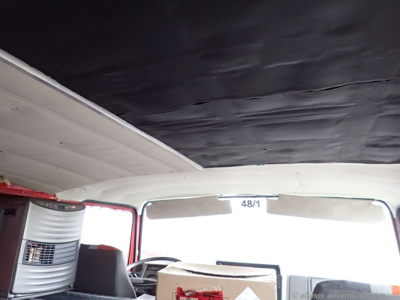 Endlich wird die Arbeit in der Doka fortgesetzt. Franky hatte lange mit sich gehardert … Eigentlich hätte er gerne eine Dachluke (um Tiere zu beobachten). Sandy ist unsicher, ob die Luke denn wirklich dicht wäre. Nun bleibt mein Dach erstmal ganz. Das Alubutylen wird zuerst über den Fahrer/Beifahrersitzen aufgebracht. Im Sommer war dieses Zeug schwieriger zu verarbeiten als jetzt. Danach kam noch eine Schicht Kaiflex. Sandy schneidet die passenden Stücke, Franky klebt. Das nennt sich Arbeitsteilung. Später klebt Sandy auch mit, damit es schneller geht.