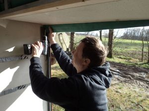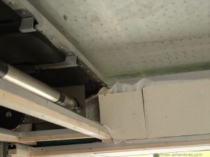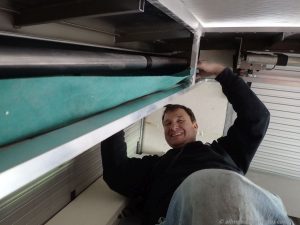 Von meinen fünf Jalousien wird die im künftigen Küchenbereich lahm gelegt. Der Motor ist schon längst demontiert, eine Abkastung ist nicht erforderlich. (Ups, hat der Franky mich doch darauf hingewiesen, dass ich gar keinen Motor an den Jalousien hatte, sondern einfach nur „Rollen“…. Also dann ist natürlich die Rolle ausgebaut 😉 ) Das spart Platz im Aufbau. Natürlich muss, wie bereits an den anderen vier Jalousien geschehen, auch hier eine Alublech-Kante drüber. Der Kauf der Popnietenzange hat sich mehr als bezahlt gemacht.