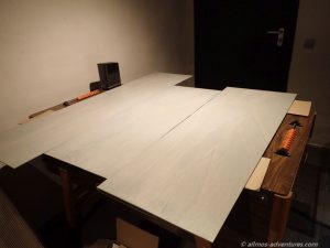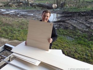 Franky wollte, dass die Farbe nur ganz dünn aufgetragen wird, damit man die Holzmaserung noch durchschimmern sieht. Kurzerhand durfte er alleine den Pinsel schwingen. Zugegebenermaßen trockneten seine Holzplatten deutlich schneller als meine. Der Platten müssen von beiden Seiten gestrichen werden, damit sie nicht rund werden.