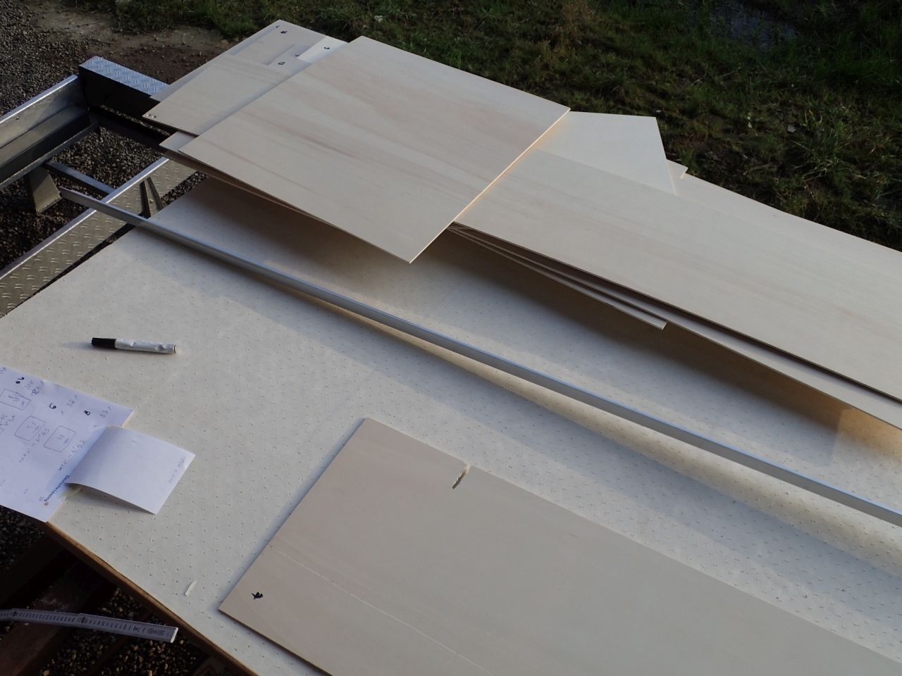 Die ersten Pappel-Sperrholz-Seiten- und Unterteile wurden im Koffer montiert. Die Frontteile können an den Jalousiekästen jedoch noch nicht angebracht werden. Zunächst muss das Dach dafür wieder richtig sitzen. Das wird aber noch etwas dauern.