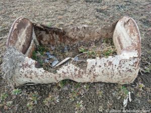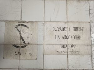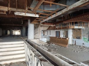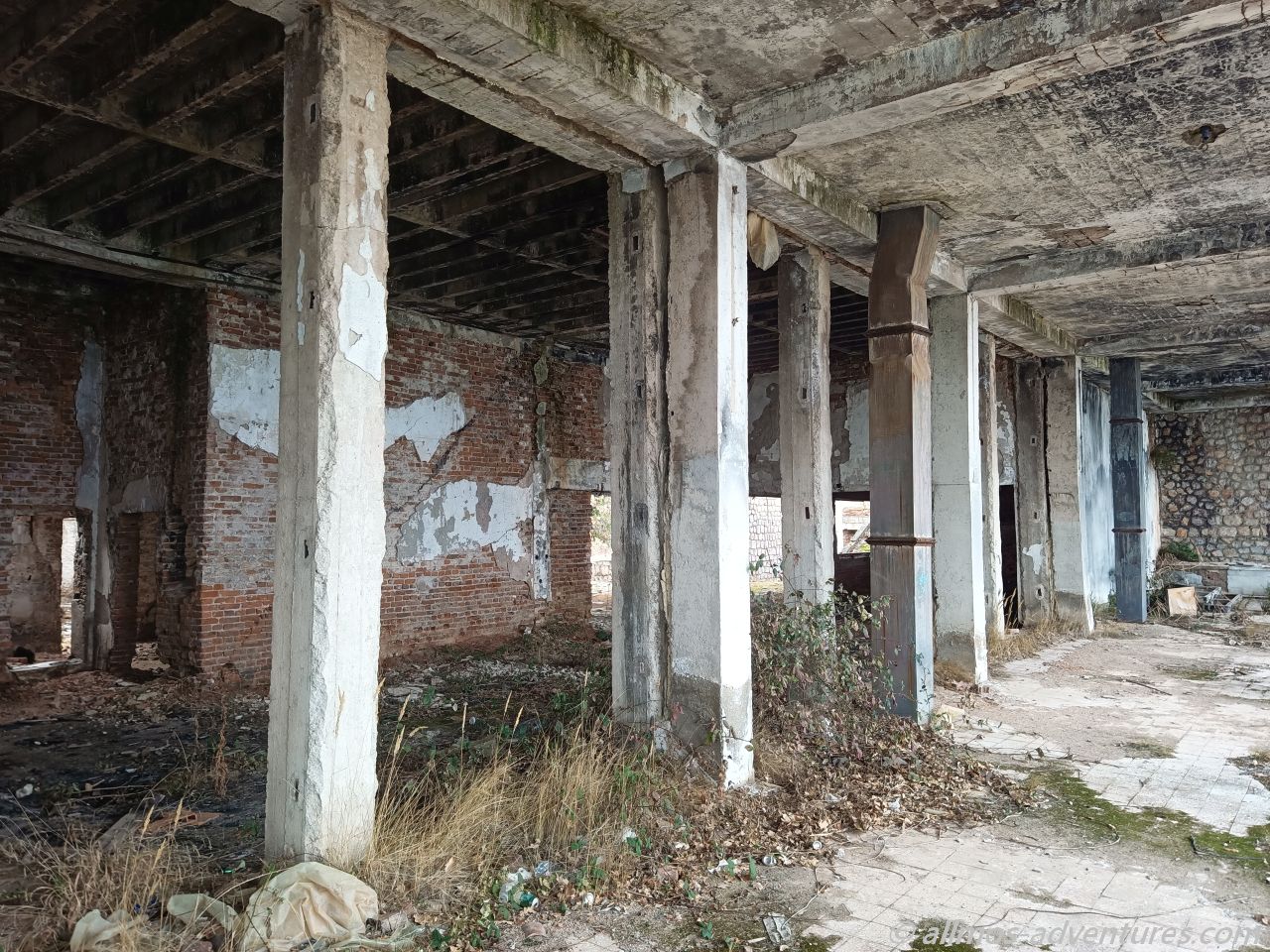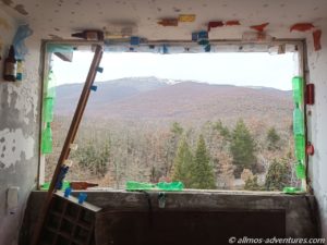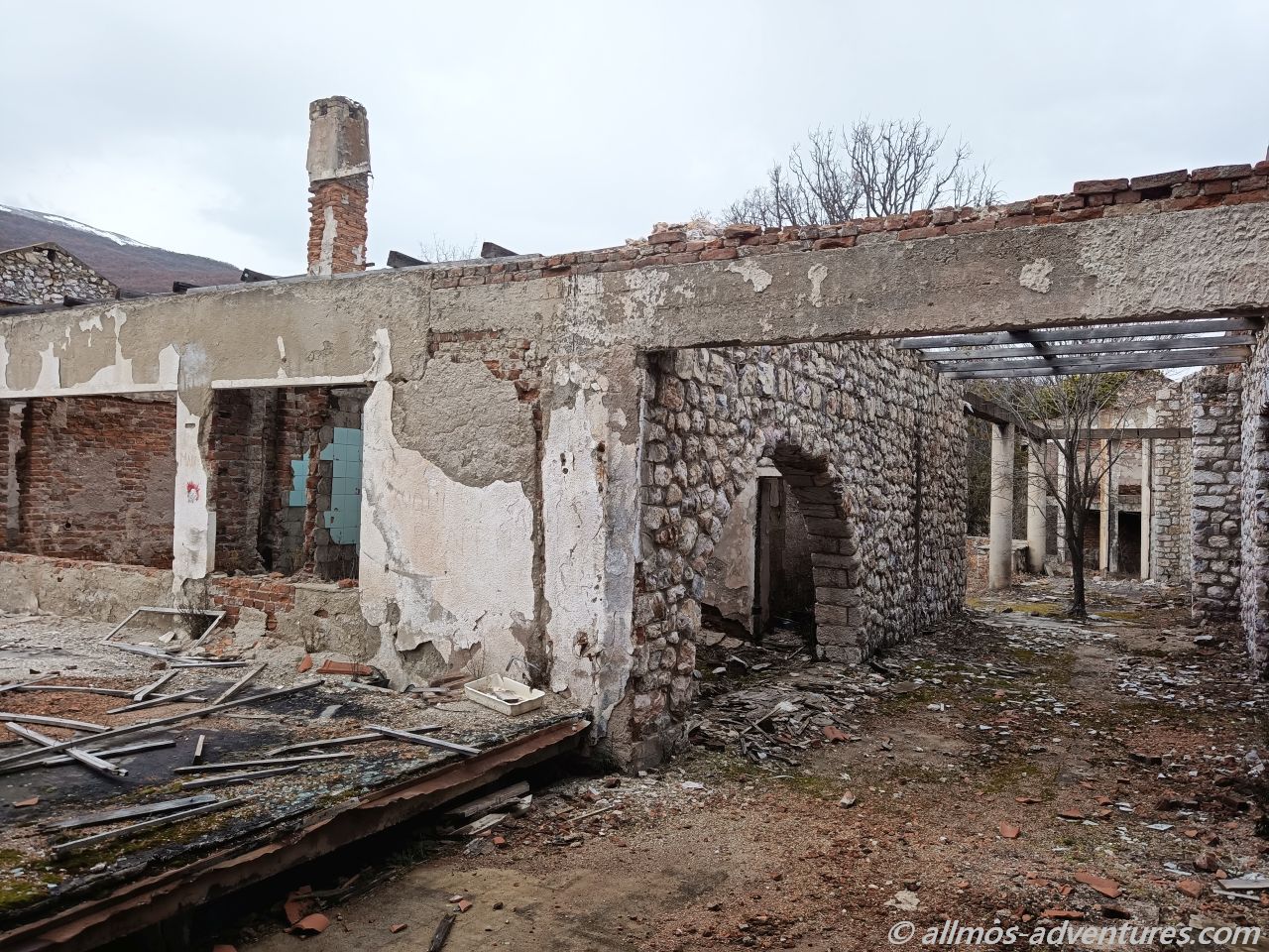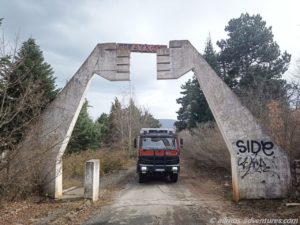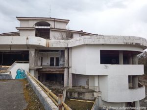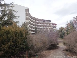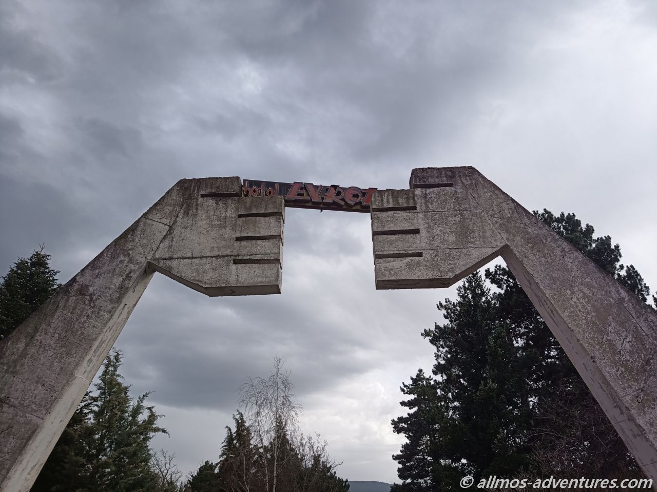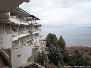 Auf dem Weg zum Prespa See hatte ich bei einer der Park4Night-Bewertungen gelesen, dass es ein verlassenes Hotel am See gibt. Das mussten wir uns natürlich näher ansehen. Durch den Eingangsbogen rollten wir auf das Hotel Europa zu. Scheiben und alles war zerschlagen. Über dem Eingangsbereich müssen früher einmal so Kunststoffbögen als Regenschutz angebracht gewesen sein. Auch diese lagen in vielen Teilen auf dem Boden. Laut Gockel-Fotos war das vor einem Jahr noch intakt. Anscheinend konnte jemand in der Zwischenzeit die Stahlkonstruktion von dem Überdach gebrauchen, denn die fehlte gänzlich.