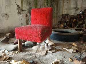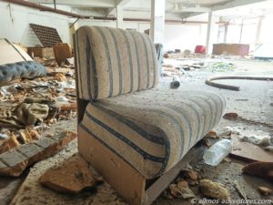Da kurz nach uns ein PKW mit vier jungen Männern aus Recklinghausen (wie das Gespräch ergab) ankam, gingen wir zunächst nach unten. Unter dem Parkdeck befand sich das Lager für Sofas, Sessel, Matratzen, Kopfkissen, Schränkchen und was da sonst noch so rum lag. Eine dicke Staubschicht lag über allem. Wer weiß, wie lange das Hotel schon nicht mehr in Betrieb ist.