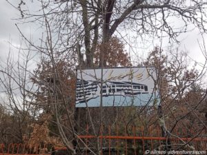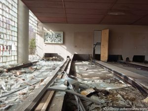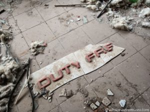 Nach dem wir noch die Bowlingbahn entdeckten gingen wir zu Fuß zu dem benachbarten Rehabilitationszentrum. Drei der Gebäude schienen nicht mehr bewohnt zu sein, was unschwer an zerschlagenen Scheiben zu erkennen war. Bei einem vierten Gebäude standen teilweise Blumentöpfe auf den kleinen Balkonen. Wir sahen uns nur in einem der verlassenen Gebäude um. In einem Raum hing ein Kalender mit dem Blatt von Mai/Juni 2001. Toiletten und Waschbecken lagen teilweise im Flur, Schränke waren von der Wand gerückt worden. Ansonsten gab das Gebäude nicht viel her.