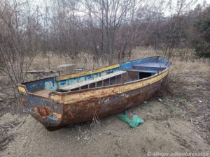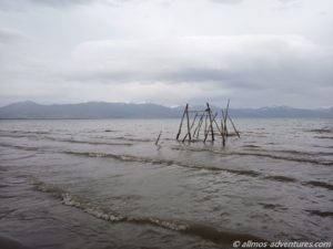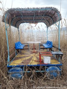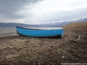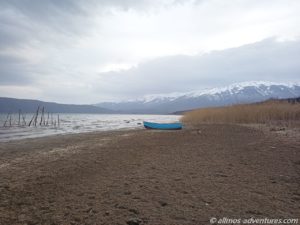 Am Ufer des Prespa Sees schwammen ein paar rostige Ölfässer herum. Zwei Boote lagen (gefüllt mit Wasser) auf dem Trockenen. Ein Party-Boot war, beinahe unsichtbar, im Schilf abgestellt. Zum Baden lädt das Wasser also nicht wirklich ein. Wie gut, dass wir bei den frischen Temperaturen darüber nicht nachdenken müssen.