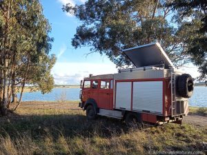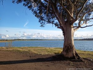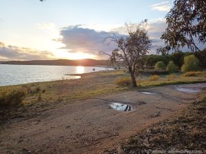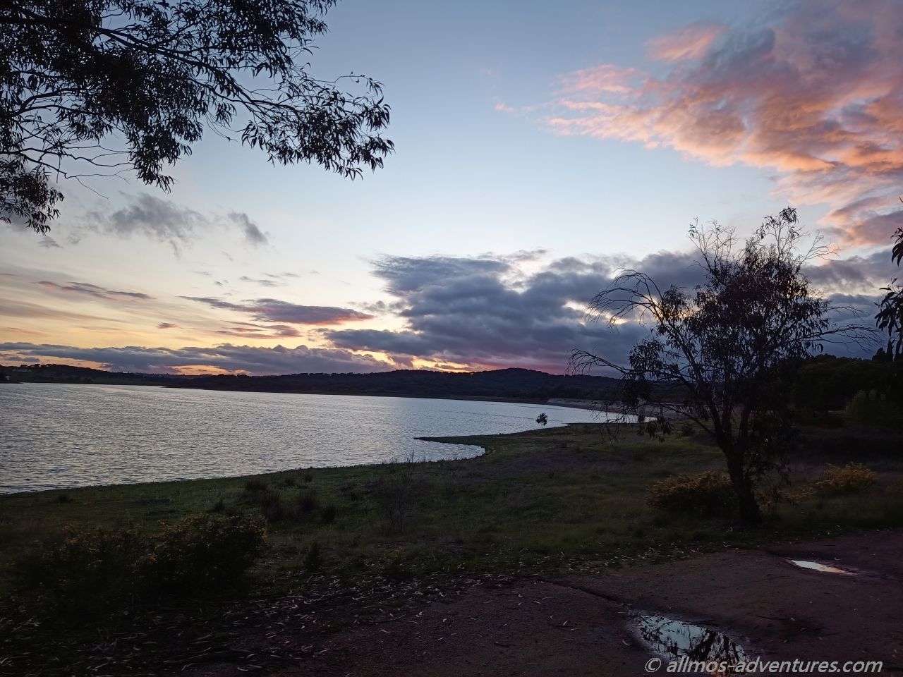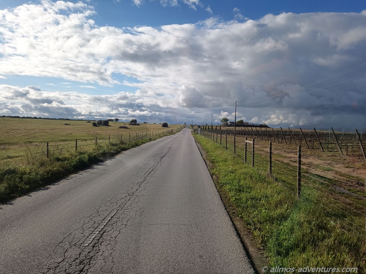 Zum Übernachten fuhren wir noch 20 km zum Stausee Barragem do Divor. Dummerweise lagen vor uns dunkle Regenwolken, während wir den schönen blauen Himmel und die Sonne hinter uns ließen. Zum Glück hielt sich seit wir in Evora waren das Wetter. Zuvor war es sehr wechselhaft.