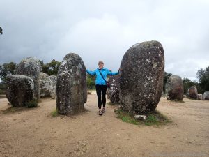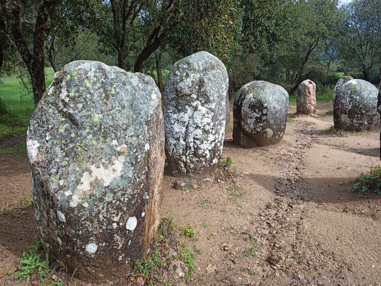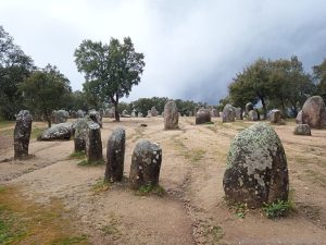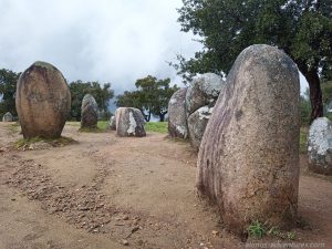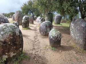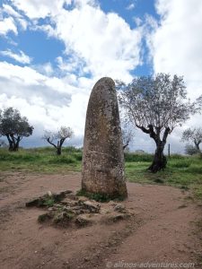 Wir programmierten das Navi mit dem Ziel Evora. Die vielen Steinhaufen (Megalithen) auf den Feldern ließen uns dann jedoch den Weg zum Cromeleque dos Almendres einschlagen. Dazu ging es zu meinem Leid wieder 4 km lang auf eine Piste. An ein paar zu sehr ausgewaschenen Stellen am rechten Wegesrand bekam ich leichte Schnappatmung, aber ansonsten war es okay.
