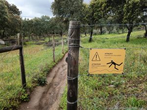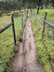 Auf dem Rückweg stoppten wir noch am Dolmen dos Almendres. Der sehr schmale Fußweg, der dorthin führte war tatsächlich in einem sehr schlechten Zustand, wie es das Schild zu Beginn ankündigte. Und so wirklich gelohnt hatte es sich auch nicht, denn am Ende des matschig rutschigen Weges stand ein einsamer Hinkelstein. Das hätten wir uns gut sparen können.