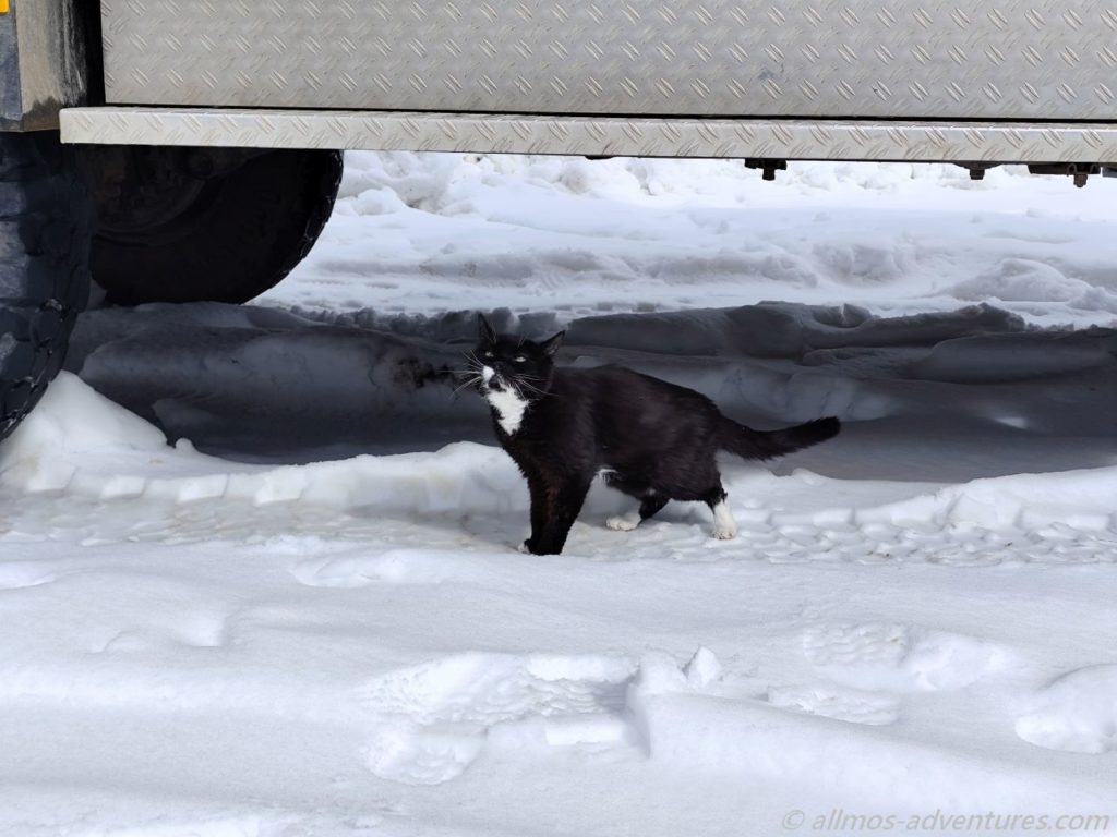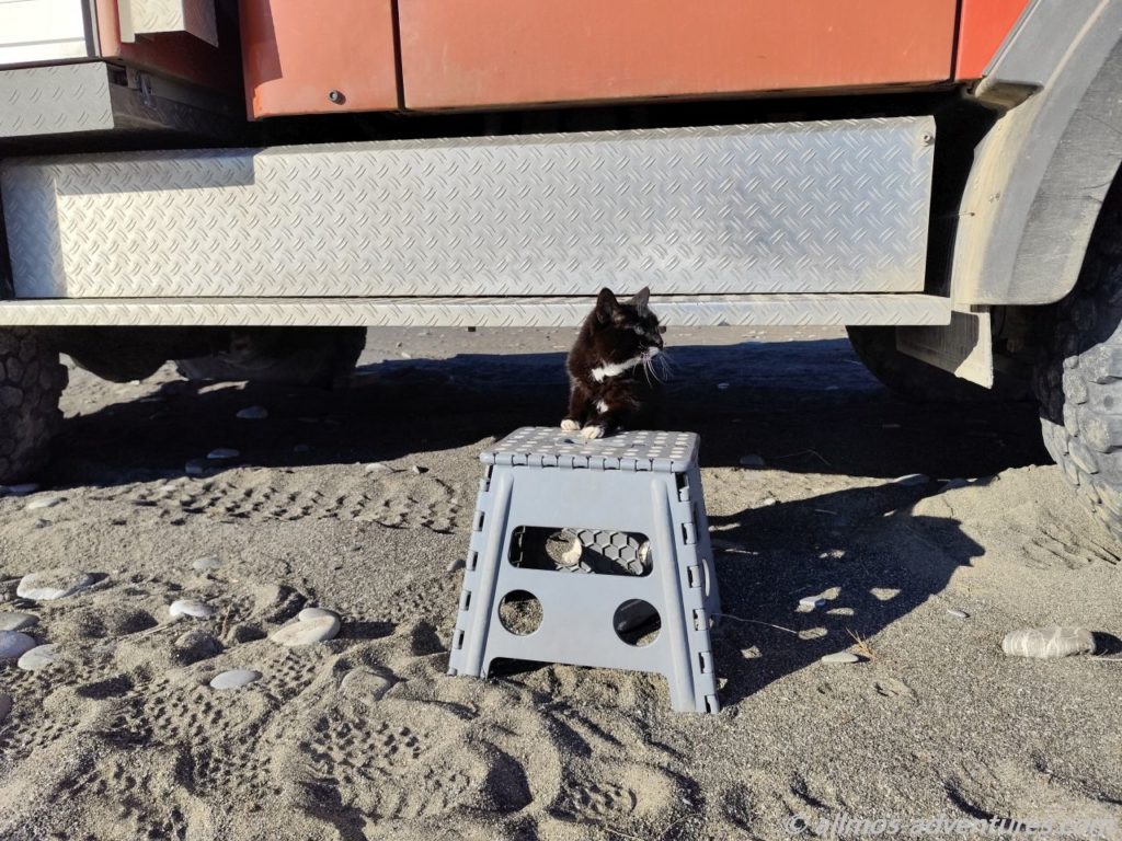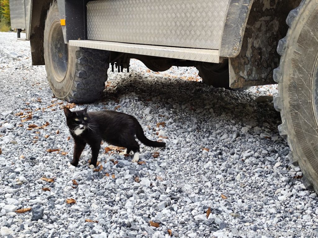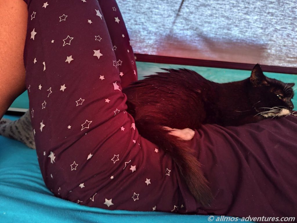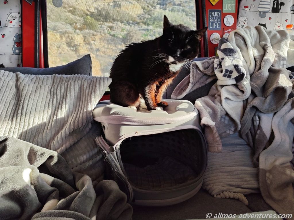 Das Glück mit einer alten Katze zu reisen ist es, dass sie wenig Entdeckerdrang hat und Allmo als ihren Zufluchtspunkt sieht. Somit müssen wir uns keine Sorgen machen, dass sie aus dem Fahrzeug springt, wenn wir die Türen offenstehen haben. (was wir eh vermeiden, damit wir keine Fliegen fangen).