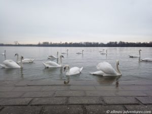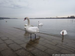 Leider fing es bereits leicht an zu tröpfeln, dabei war es noch keine halb 11 Uhr. Hätte der Regen nicht noch etwas warten können? Am Ufer der Donau lagen mehrere Restaurant-Schiffe. Doch das eigentliche Highlight waren die Schwäne, die entlang des Ufers ihre Runden drehten. Fast 50 konnten wir zählen. So eine riesige Menge Schwäne hatten wir bisher noch nicht an einem Fleck gesehen. Interessant war auch, wie diese aus dem Wasser auf den Weg krabbelten und wie sie sich wieder zu Wasser ließen. Neugierig wurden wir beäugt. Wie gut, dass wir kein Brot zum Füttern dabei hatten. Wer weiß, wie sie darauf reagiert hätten.