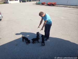 Auf dem Parkplatz wurden wir direkt von 4 Hundewelpen begrüßt, die wie ein Flummi hochsprangen, als sie merkten, dass die Menschen aus dem großen roten Ding Futter hatten.
