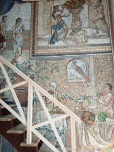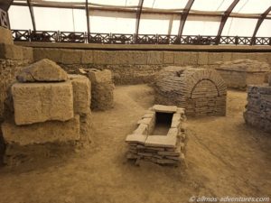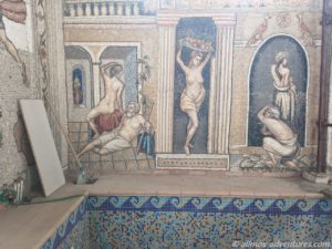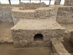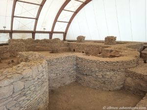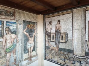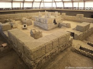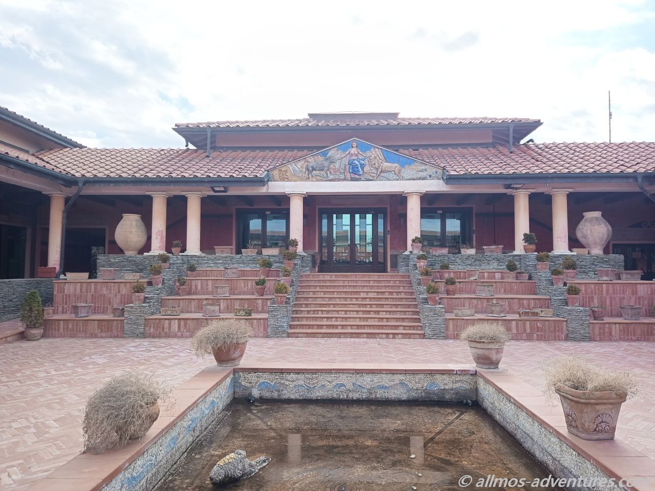 Danach fuhren wir jeder mit seinem eigenen Fahrzeug bis zu den ehemaligen Bädern und dem Amphitheater. Letzteres hatte eine Unterkonstruktion aus Stein und die Tribünen waren aus Holz gebaut. Ein Teil der Holzkonstruktion wurde zwischen 2013 und 2018 nachgebaut. Die Bäder bestanden aus Kalt-, Warm- und Heiß-Wasserbecken. An einer winzigen Stelle waren noch die ursprünglichen Zeichnungen mit zwei Olivenbaumzweigen sichtbar. Auch Bodenmosaike waren, wenn auch in geringer Zahl, vorhanden. In Teil der Bäder wurde bereits rekonstruiert.
