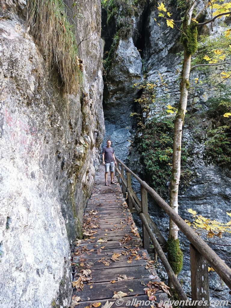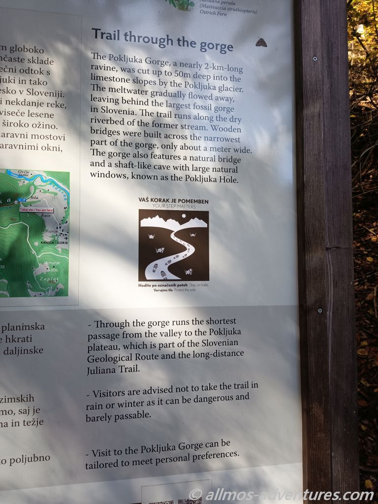 Wir können den Spaziergang in der Pokljuka Schlucht sehr empfehlen. Wer nicht den ganzen Bogen laufen möchte (insgesamt waren es für uns 7,5 km, wir konnten aber nicht bis zum Wanderparkplatz fahren, ansonsten wären es nur 6,5 km gewesen), dem empfehlen wir an der T-Kreuzung den linken, Shorttrail, bis zur Galerie zu nehmen, den Weg bis über die Galerie und die Stufen hinaufzugehen und dann wieder umzudrehen. Wieder an der T-Kreuzung kann man noch kurz den rechten Weg einschlagen und dann wieder umkehren. Das großartige ist, dass die Wanderung nichts kostet.